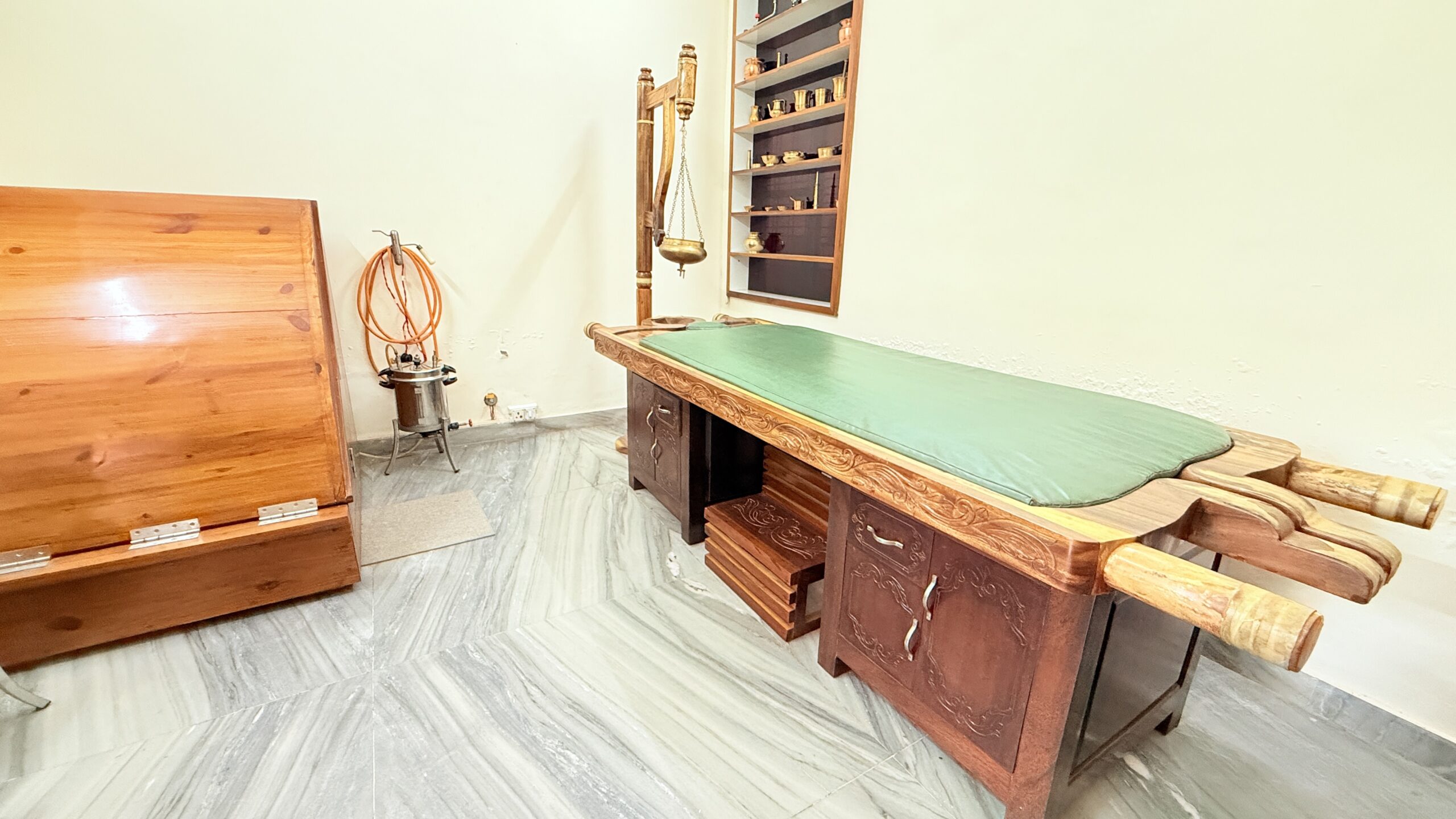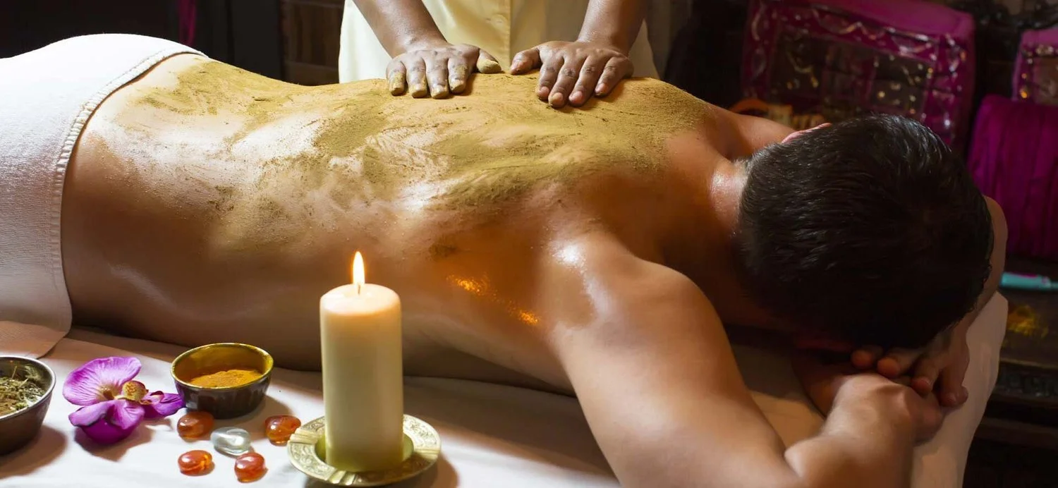 "Udvartana ( Powder massage ) is an Ayurvedic herbal scrub used with an upward massage. It helps exfoliate the skin, remove toxins, improve circulation, reduce fat or cellulite, and balance Kapha. It also supports weight loss and gives the skin a healthy glow."